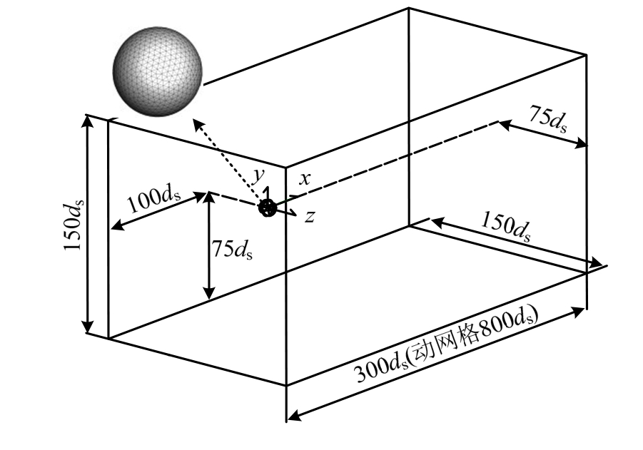假设颗粒位于无界流场中且弛豫效应及变速过程均属于小时间空间尺度问题。对于静风气动力验证工况,根据粒径确定的计算域尺寸为x×y×z=300ds×150ds×150ds;对于颗粒自由沉降及强迫运动模拟工况,建立计算域为x×y×z= 800ds×150ds×150ds。初始状态颗粒均位于坐标原点,其形心距迎风边界100ds,距各侧面边界均75ds,计算域尺寸设置如图 1。对于静风计算工况,入口边界设置为速度进口,出口边界设置为压力出口,四周设为对称边界;对于运动颗粒的动网格模拟,由于颗粒与流场存在互馈现象,分别采用两套边界条件进行无界场验证:所有边界均设为对称边界(Bdr.1);原入口边界设为压力出口,出口边界设为无滑移壁面,四周设置为对称边界(Bdr.2)。