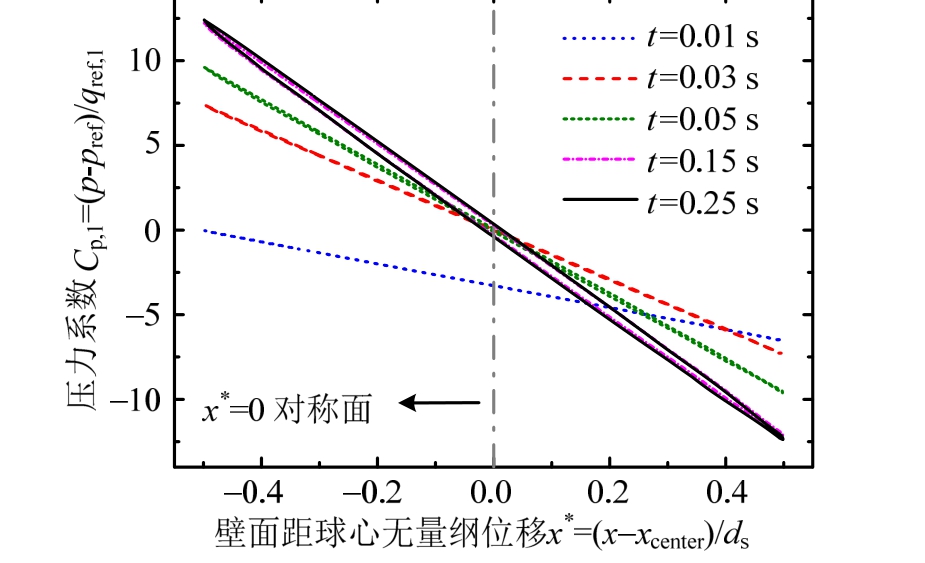 对不同时刻下驻点及分离点静压变化速率进行分析后还发现,颗粒受介质非定常气动力的影响时间大致在t= 0.15 s以内,之后尽管颗粒x方向沉降线速度变化率已小于 1‰,但壁面驻点与分离点的静压值仍发生轻微改变。这一现象表明气、固两相间的非线性气动效应并非在颗粒运动速度接近终端沉降速度时立即消失,其后较长时期内,各气动外力间的协调变化都是维持颗粒在当前运动方向下,线速度保持不变的主要外因。
