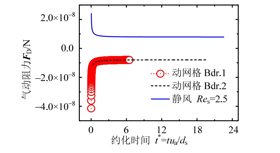 验证主要包含两部分内容:Stokes流下的静风阻力系数求解,用于确保不同粒径下,网格划分精度与时间离散步长等参数对Res变化的适应性及模拟结果的有效性;静止空气中颗粒以对应风速进行匀速运动,该工况主要用于考察网格弹簧变形及分裂合并是否对模拟结果产生显著影响。
