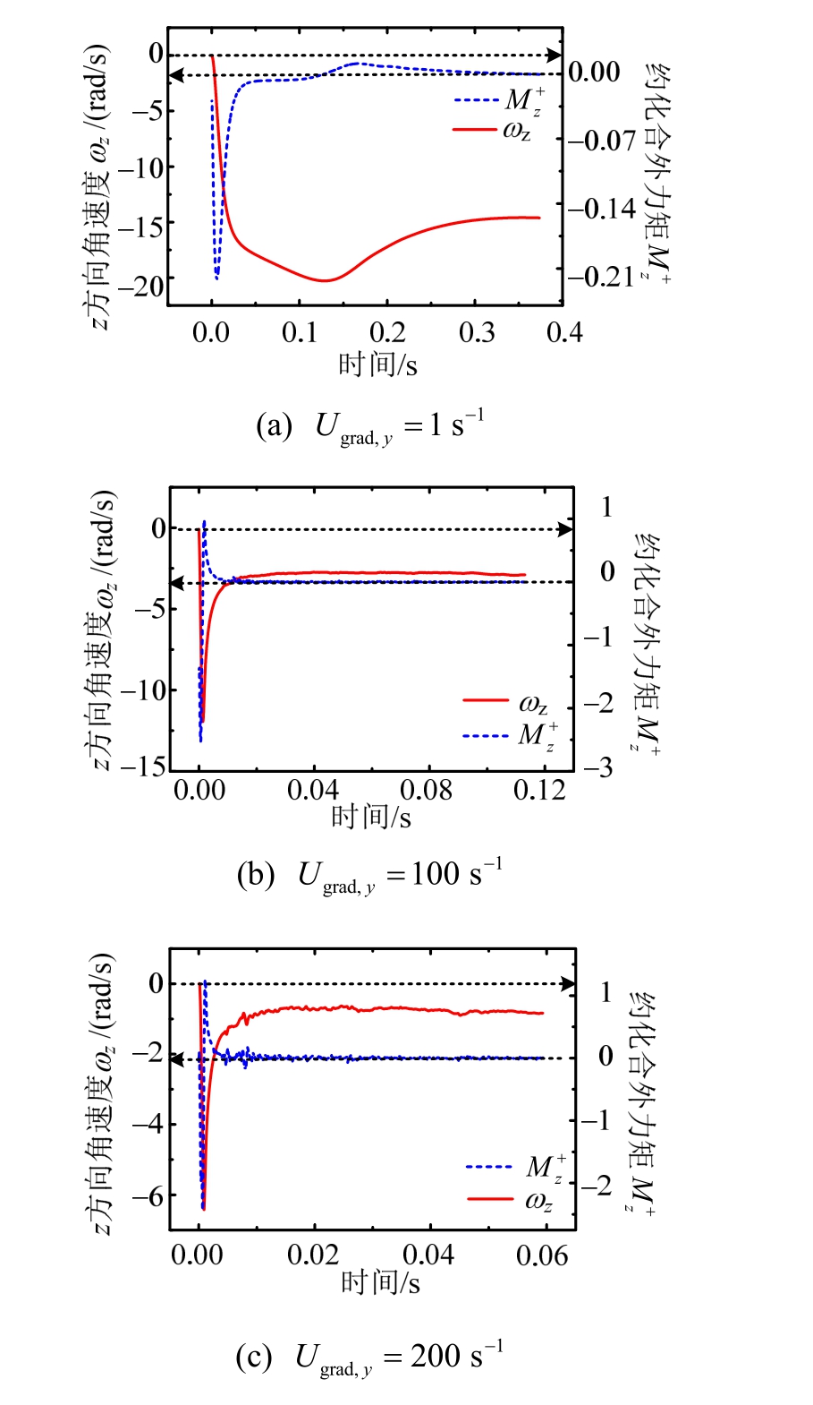 的大梯度情况,颗粒所受合外力矩及旋转速度将在较短时间内(t<0.02 s)趋于稳定,且随着