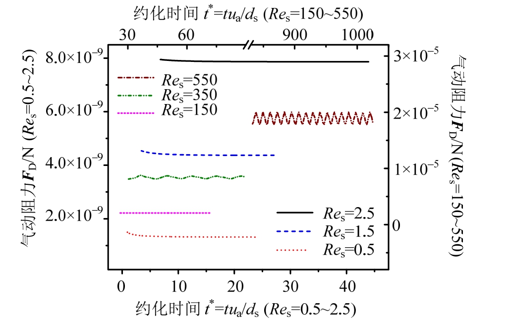 如图所示,当Res在0.5~150,计算静风气动阻力在达到稳定状态时恒为常数,当Res超过350时,计算稳定的气动阻力开始出现周期性振荡,表明该Res下的介质绕流可能不再完全服从 Stokes层流行为,且随着Res的继续增大,来流对确定粒径颗粒的周期性激励频率增大,计算平均气动阻力也单调递增。