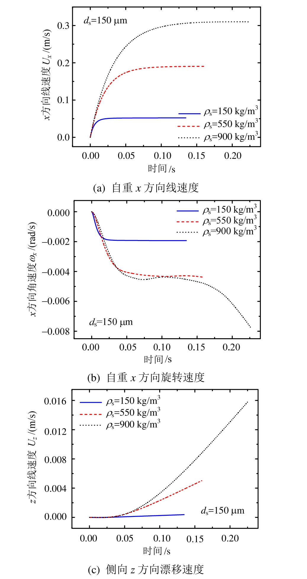 如图7(a)所示,粒径ds=150 μm的颗粒在完全均匀介质条件下,自由沉降x方向终端线速度分别约为0.31 m/s、0.19 m/s及0.05 m/s,速度随颗粒密度单调变化。根据各曲线达到水平稳定所需最短时间,可大致对各密度颗粒的弛豫效应进行判断,即密度较小的颗粒松弛时间较短,可能存在更好的流场跟随性,且受到与流场相对变速运动有关的附加质量力与Basset效应历时更短。总体来讲,不同密度颗粒的自沉线速度均在0.2 s内达到稳定,因此,相对于大时间尺度下的积雪搬运二次堆积过程,颗粒的变加速阶段可近似忽略。