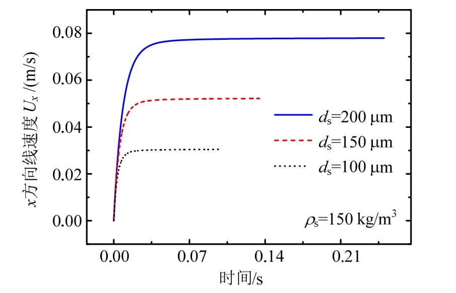 图 9为计算密度 150 kg/m3的三种粒径(ds= 100 μm 、ds= 150 μm 、ds= 200 μm)颗粒在发生自由沉降时,重力x方向的线速度时程分布规律。如图所示,在颗粒密度确定的情况下,随着粒径的增大,计算稳定沉降终端速度单调递增,表明粒径的增大虽造成了迎风面积的增大,对阻力系数产生影响,但其效应远不及颗粒自重增量对运动加速产生的影响。