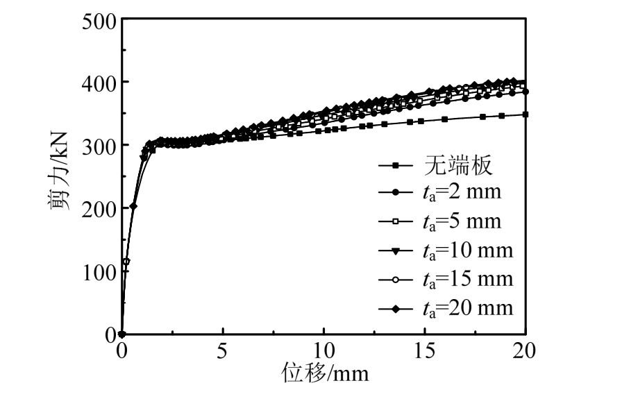 为了分析端板对试件剪切性能的影响,对不同端板刚度矩形钢管混凝土试件进行数值计算。因端板刚度是其厚度ta的函数,为表达方便,在分析中直接用端板厚度ta反映刚度的影响文献[1]。计算条件同样与试验试件Rλ-0.3相同,ta取2 mm、5 mm、10 mm、15 mm、20 mm 并与无端板计算结果进行对比,图15给出了不同端板厚度情况下的剪力-荷载位移关系曲线。从图中可以看出,带端板与否对试件剪力-位移关系曲线有一定的影响,主要表现为曲线后期的强化,有端板的试件曲线后期强化比无端板试件明显,并且随着端板厚度的增大,曲线后期强化越来越显著;所有情况的剪力-位移曲线弹性阶段刚度几乎重合,仅有无端板情况存在微小差异,屈服平台值也相近,因此,端板的有无对构件抗剪承载力有一定影响,而端板厚度影响不大。