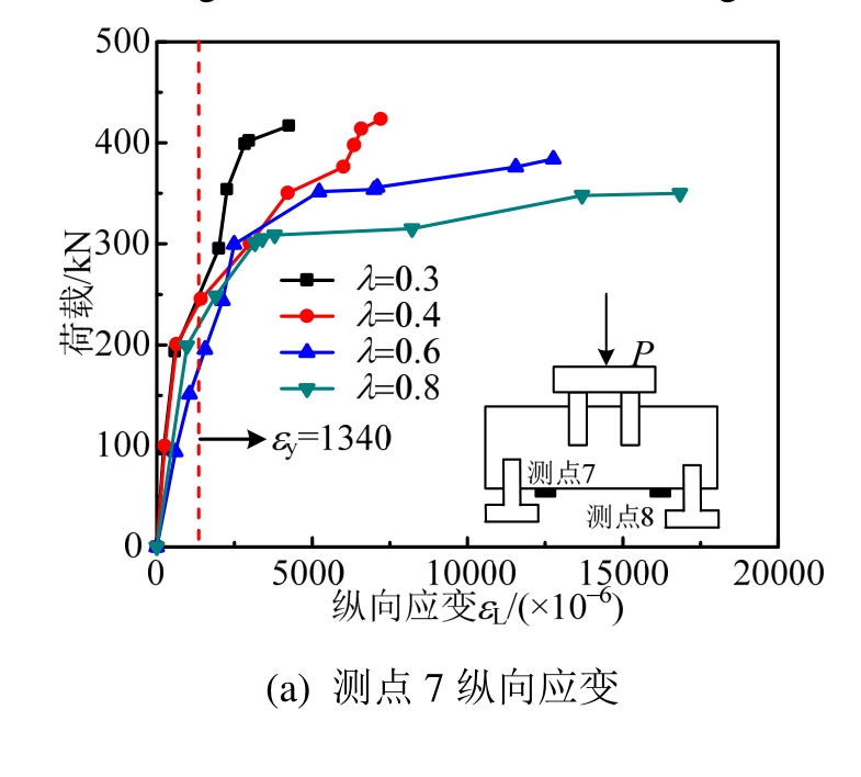 从图中可以看出在忽略试验误差的情况下,对称测点7和8的应变变化规律接近。当构件剪跨比较小时(λ=0.3和λ=0.4),在施加相同横向荷载的条件下,纵向应变值相对较小,随着剪跨比增大,构件纵向应变显著变大,这是因为在相同横向荷载作用下大剪跨比构件产生较大弯曲变形,导致外部钢管纤维发生较大纵向应变,达到峰值荷载前,所有构件的纵向应变值都大于钢材屈服应变εy,表明钢管混凝土构件具有较好的变形能力。