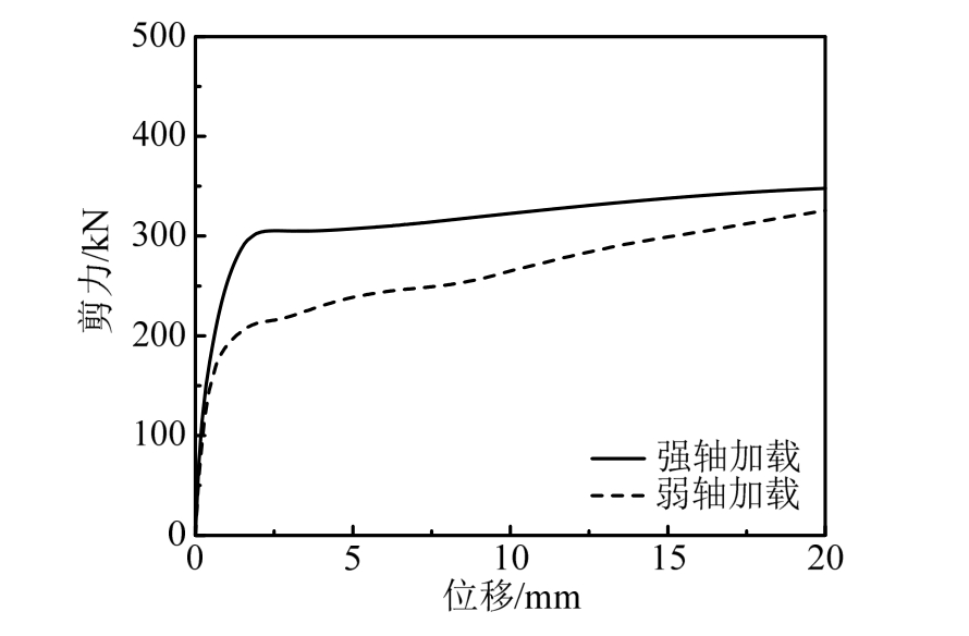 矩形截面试件沿截面不同主轴方向加载时,试件截面受剪高度显著不同。为了分析不同的加载主轴方向对矩形钢管混凝土构件剪切性能的影响,分别建立了沿受弯强轴和弱轴方向加载时的有限元模型,计算条件同样选取试验试件Rλ-0.3。利用位移加载方式施加荷载,两者施加相同的位移,提取了试件最终的剪力-位移关系曲线如图16所示。从图中对比曲线可以看出,试件沿强轴加载下的抗剪承载力与弱轴下的相比有较大程度的增幅,约增长20%;强轴加载时构件先进入屈服平台,弹性阶段刚度比弱轴加载时有增加的趋势,曲线后期强化现象无弱轴加载时显著。