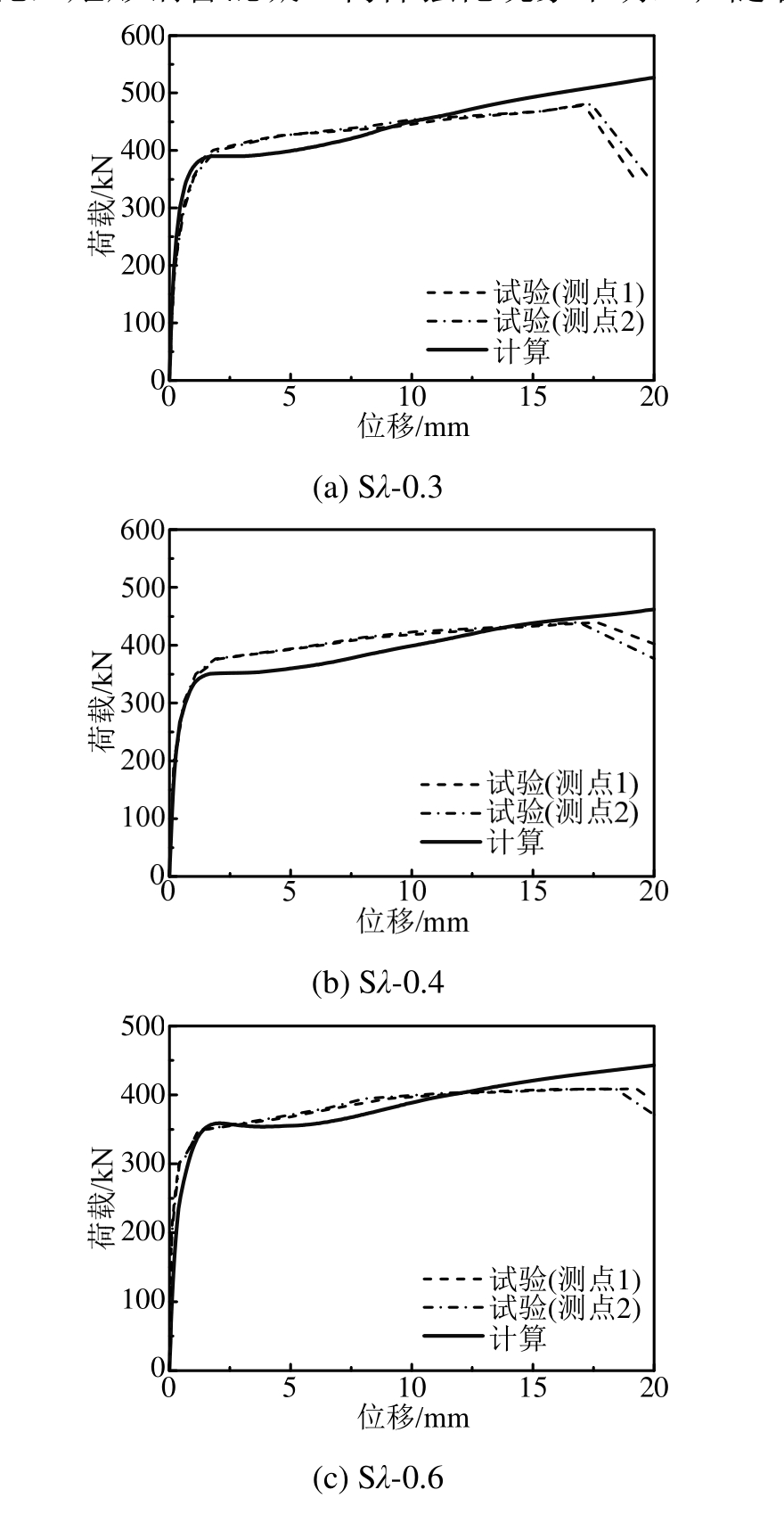 基于上述的建模方法建立了矩形钢管混凝土构件受剪有限元模型,有限元模拟计算得到的荷载-位移关系曲线和试验曲线结果如图6所示,可见数值模型曲线与试验曲线吻合较好。图 11给出了有限元模拟试件的破坏模式与试验结果的对比情况,有限元软件ABAQUS能较好模拟其破坏模式,即有限元模拟将试件的最终变形及核心混凝土与钢管之间的滑移很好地模拟出来。