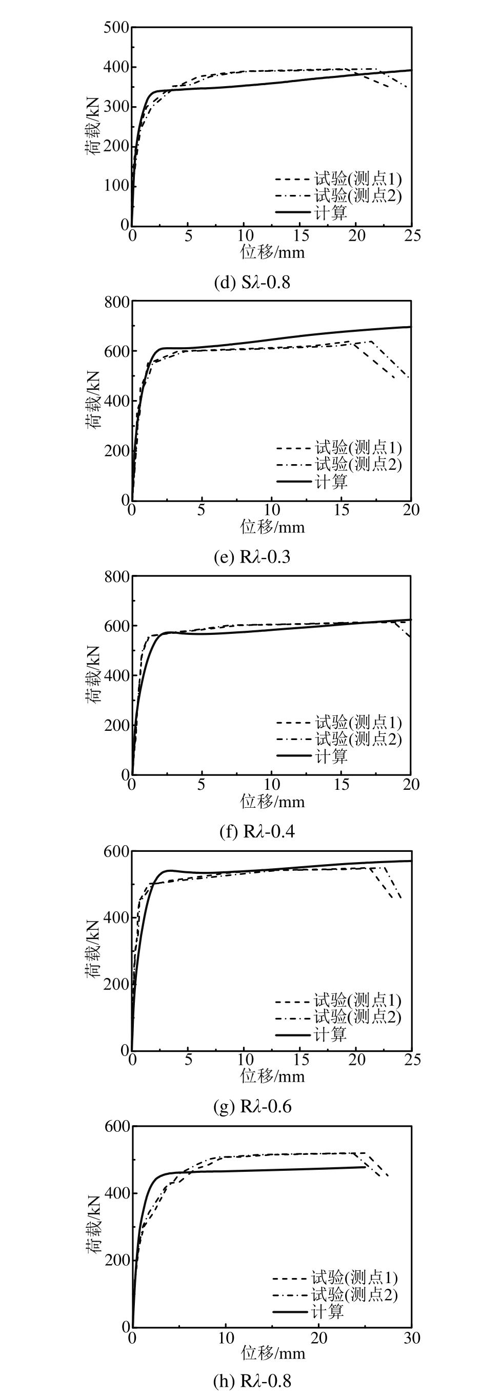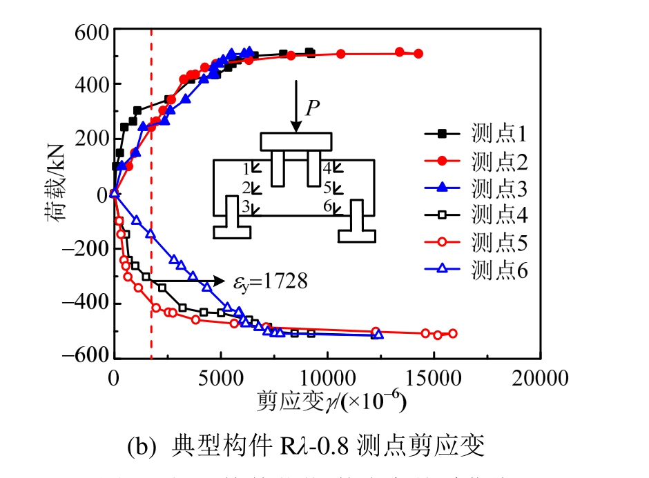图9和图10分别给出了在加载过程中方、矩形钢管混凝土典型构件(Rλ-0.3、Rλ-0.8 和 Sλ-0.3、Sλ-0.8)横向荷载-剪应变关系曲线,为了便于观察比较对称测点应变,将测点4~测点6荷载转化为负值。从图中可以看出方、矩形钢管混凝土典型构件剪应变变化规律相似,中截面测点2和测点5剪应变明显高于其他测点,且测点剪应变关于中截面近似均匀对称分布;当剪跨比较小时(λ=0.3),剪应变值较大,此时构件发生剪切破坏,当剪跨比较大时(λ=0.8),剪应变值较小,构件纵向应变较大,构件底部被拉裂,此时构件发生弯曲破坏;小剪跨比构件发生破坏时构件变形和裂缝对称,因此对称测点剪应变变化规律相似,大剪跨比构件发生破坏时构件底部只有一侧有裂缝,变形不对称,因此对称测点剪应变变化规律不完全相同。