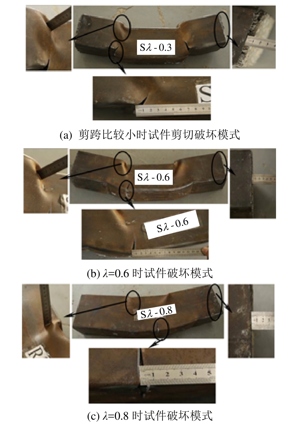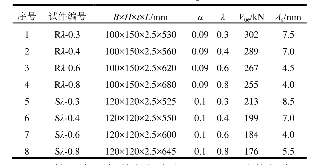 序号 试件编号B×H×t×L/mmαλVue/kNΔs/mm 1 Rλ-0.3 100×150×2.5×530 0.09 0.3 302 7.5 2 Rλ-0.4 100×150×2.5×560 0.09 0.4 289 7.0 3 Rλ-0.6 100×150×2.5×620 0.09 0.6 267 4.5 4 Rλ-0.8 100×150×2.5×680 0.09 0.8 255 4.0 5 Sλ-0.3 120×120×2.5×525 0.1 0.3 213 8.5 6 Sλ-0.4 120×120×2.5×550 0.1 0.4 199 7.0 7 Sλ-0.6 120×120×2.5×600 0.1 0.6 184 4.0 8 Sλ-0.8 120×120×2.5×645 0.1 0.8 176 5.5