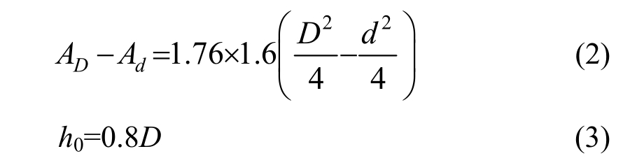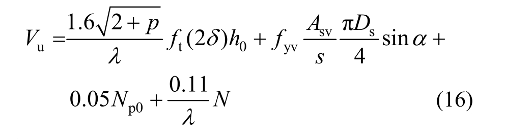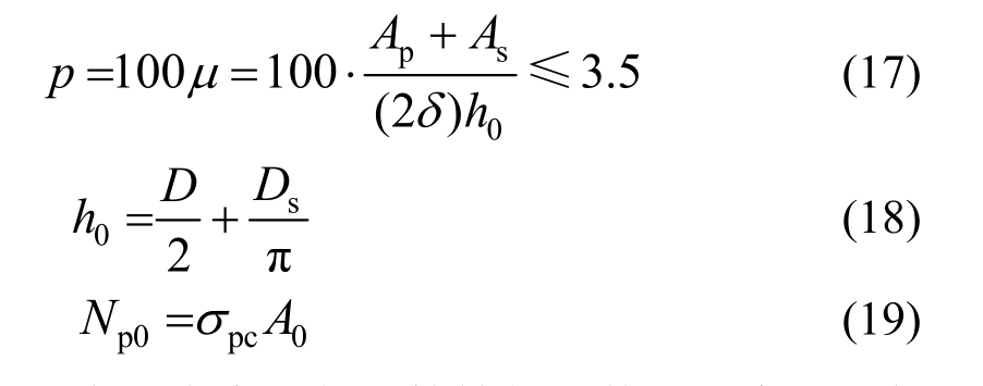 式中:Vu为预应力混凝土管桩的抗剪承载力;μ为斜截面受拉区纵向钢筋的配筋率,当p>3.5时,取p=3.5;λ为剪跨比,当λ<1.5时,取1.5,当λ>3时,取3;δ为环形截面的壁厚;h0为当量有效高度;D为管桩直径;Ds为箍筋中心线所围成的圆周直径;α为箍筋与环形截面中心线的夹角;Np0为预加力;N为轴向压力,当N>0.3fcA时,取N=0.3fcA。