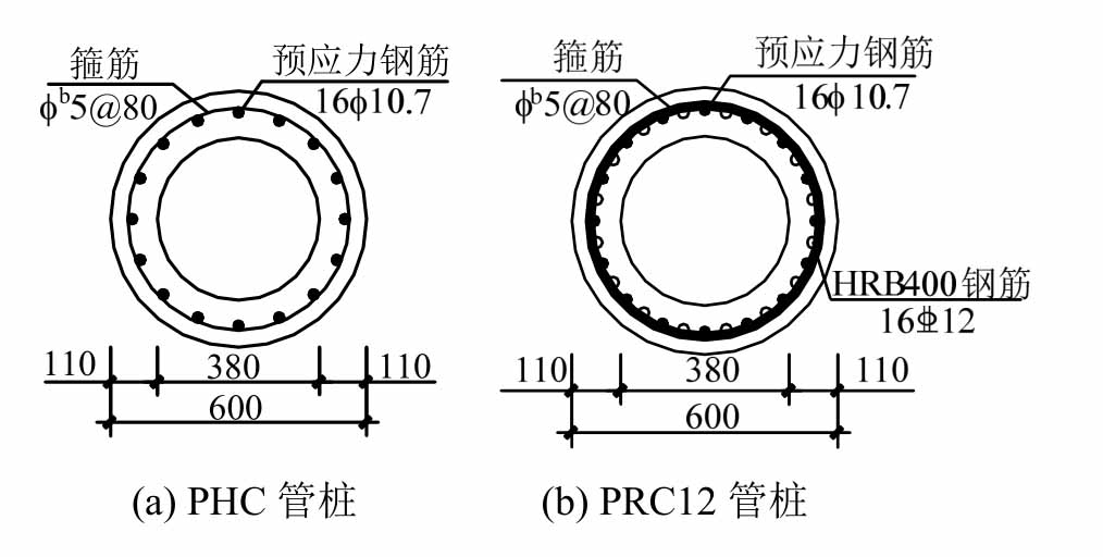 本文共对 10根预应力混凝土管桩进行了试验研究,包括3根PHC管桩和7根PRC管桩。管桩外径为600 mm,内径为380 mm,混凝土强度等级为 C80,预应力钢筋为