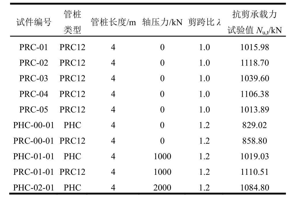 试件编号 管桩类型 管桩长度/m 轴压力/kN 剪跨比λ抗剪承载力试验值Nu,t/kN PRC-01 PRC12 4 0 1.0 1015.98 PRC-02 PRC12 4 0 1.0 1118.70 PRC-03 PRC12 4 0 1.0 1039.60 PRC-04 PRC12 4 0 1.0 1106.38 PRC-05 PRC12 4 0 1.0 1013.89 PHC-00-01 PHC 4 0 1.2 829.02 PRC-00-01 PRC12 4 0 1.2 858.80 PHC-01-01 PHC 4 1000 1.2 1019.03 PRC-01-01 PRC12 4 1000 1.2 1110.51 PHC-02-01 PHC 4 2000 1.2 1084.80