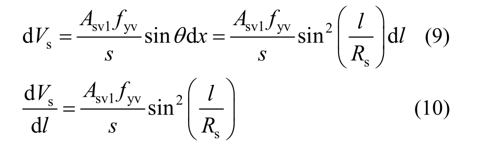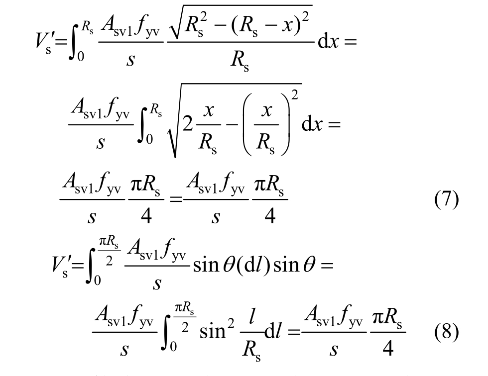 凌应轩等[20]针对预应力混凝土管桩抗剪公式的箍筋项做了理论推导,假想将箍筋的1/4圆周弧线拉直并假定其提供的竖向分力沿箍筋圆周按线性分布,即1/4箍筋提供的竖向分力沿圆周从0至Asv1fyv/s线性分布,所以1/4箍筋所提供的剪力按式(5)计算。