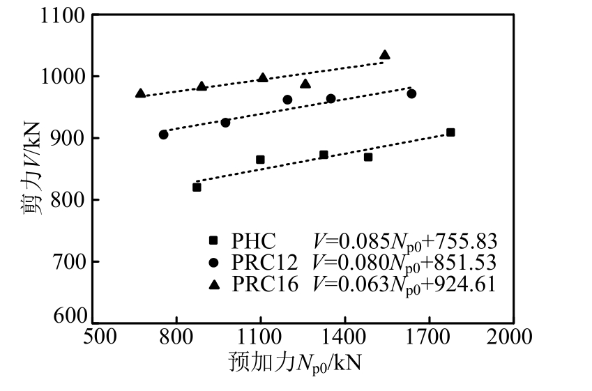 对PHC管桩、PRC12管桩和PRC16管桩在预应力钢筋张拉控制应力分别为0.45倍、0.55倍、0.65倍、0.72倍和0.85倍钢筋抗拉强度标准值时的极限剪力进行了有限元计算,计算结果如图 11所示。由图可知,预应力管桩的抗剪承载力随着预加力的增加而增大,总体上成线性关系。考虑到 GB 50010-2010《混凝土结构设计规范》[21]中对混凝梁抗剪承载力的预应力项采取了同样的形式,可以认为预应力项取为0.05Np0是安全的。