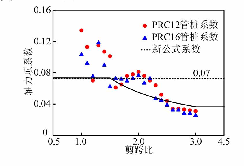 根据不同剪跨比下PRC12和PRC16的抗剪承载力的有限元计算,轴力项系数受剪跨比因素影响较大,系数与剪跨比关系如图16所示。