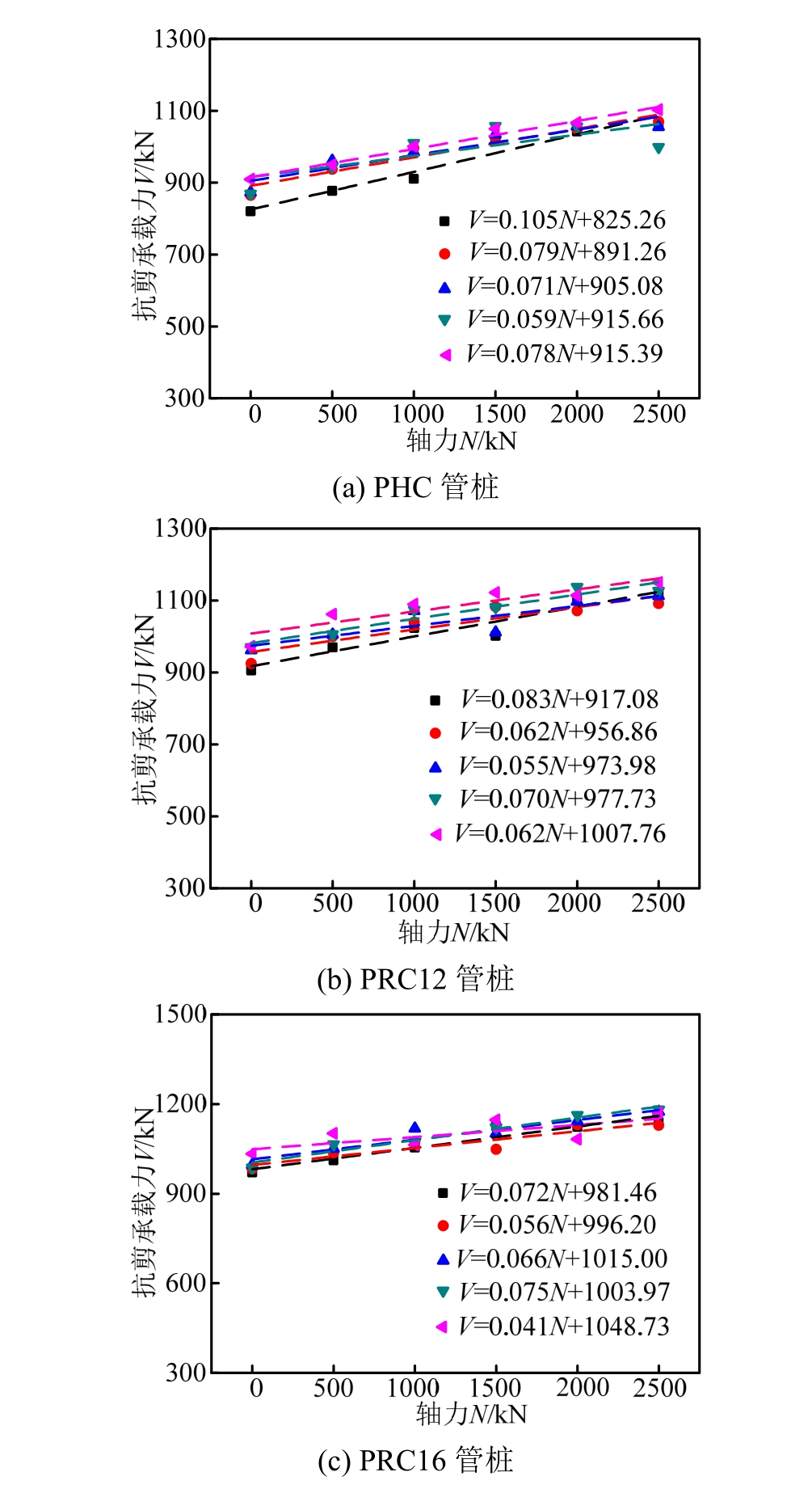 4) 轴压力对管桩的抗剪承载力有明显的提高。轴压力为1000kN时,PRC管桩的极限剪力相比于无轴压时提高了29.3%。