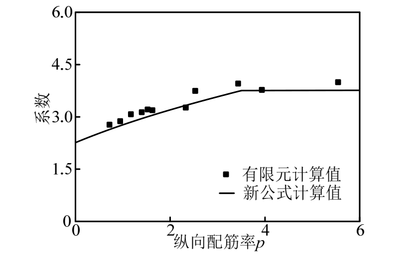 由图可知,随着剪跨比的增加,轴力项系数逐渐减小,基本成反比关系。若将轴力系数取为0.07,在剪跨比较大的情况下公式计算值不安全,高估了轴向压力对抗剪承载力的提高作用。图中曲线的公式系数取为0.11/λ,与有限元计算值吻合良好。