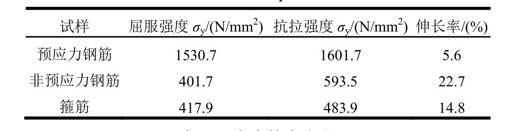 试样 屈服强度σy/(N/mm2) 抗拉强度σy/(N/mm2)伸长率/(%)预应力钢筋 1530.7 1601.7 5.6非预应力钢筋 401.7 593.5 22.7箍筋 417.9 483.9 14.8