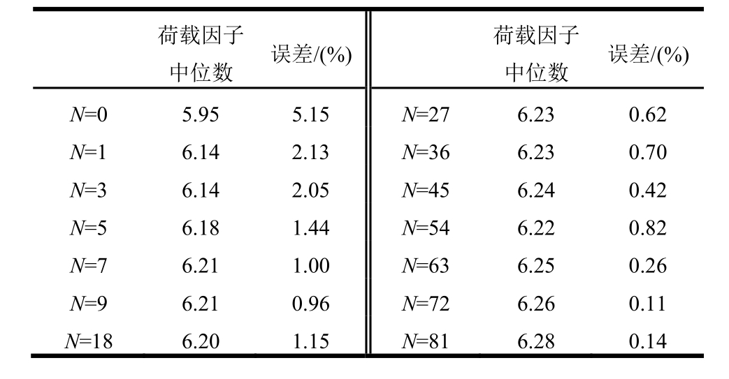 荷载因子中位数 误差/(%) 荷载因子中位数 误差/(%)N=0 5.95 5.15N=27 6.23 0.62N=16.14 2.13N=36 6.23 0.70N=36.14 2.05N=45 6.24 0.42N=56.18 1.44N=54 6.22 0.82N=76.21 1.00N=63 6.25 0.26N=96.21 0.96N=72 6.26 0.11N=186.20 1.15N=81 6.28 0.14