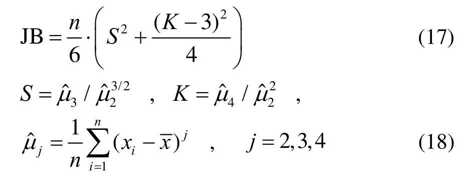 式中:n表示样本的个数;S、K分别表示样本的偏度和峰度;ˆjμ(j= 2,3,4)分别表示样本2阶、3阶和4阶中心矩的估计值。