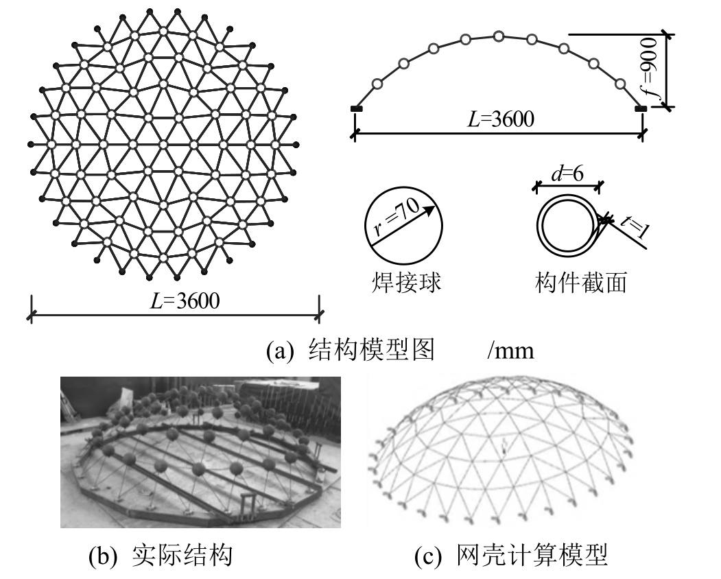 K6网壳缩尺模型的基本参数如下:跨度L=3.6 m,矢高f=0.9 m,矢跨比f/L=1/4,焊接球节点半径r=0.07 m,节点质量m=11.27 kg,结构杆件均采用ϕ6×1,材性为Q235钢材,结构实际模型如图3(b)所示。网壳的计算模型对原缩尺模型进行适当简化,其节点和支座的坐标采用缩尺模型节点和支座坐标实测数据;焊接球节点简化为位于球心位置的无体积质点,质点坐标采用缩尺模型节点坐标;构件截面采用缩尺模型的杆件截面,构件两端延伸至焊接球节点球心位置;模型的周边约束采用固端约束,各构件间节点连接形式均为刚接;材料本构采用理想弹塑性模型,弹性模量E0= 2.06×105N·mm−2,屈服强度fy= 235 MPa,泊松比ν=0.3。网壳结构计算模型如图3(c)所示。