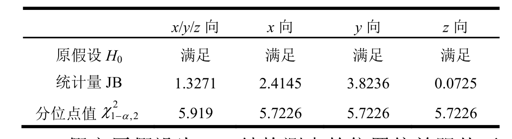 x/y/z向x向y向z向原假设H0满足 满足 满足 满足统计量JB 1.3271 2.4145 3.8236 0.0725分位点值21α,2χ-5.919 5.7226 5.7226 5.7226