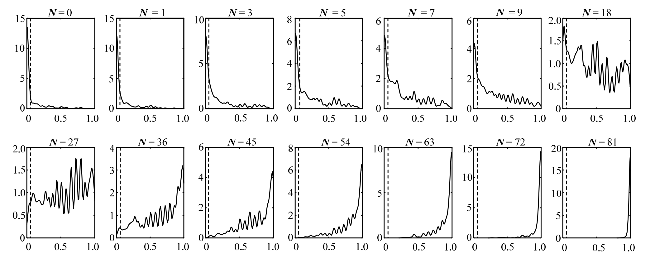 表2给出了14组样本中各组满足原假设的样本数,由表2可知,当已知节点数目N较少时,满足原假设的节点随机偏差样本数较少;当N增加到节点总数的1/10,即N=9时,满足原假设的样本占比可达到75%左右;当N大于节点总数的1/5时,满足原假设的样本占比均大于90%。各组样本中原假设成立的概率密度分布曲线如图6所示,其中横坐标表示K-S检验的p值,红色虚线表示检验的置信水平。由图6可知,随着N的增加,满足原假设的样本显著增加,概率密度分布曲线形状发生变化,样本的p值从左侧集中逐渐变为右侧集中,且代表相似度水平的p值逐渐趋近于1,说明生成的节点位置偏差和节点实际的位置偏差相似度较高。采用随机缺陷法引入的缺陷,其缺陷分布与实际缺陷分布相同的样本占比14.8%,低于随机偏差传播法引入缺陷的样本占比;采用一致缺陷模态法引入的缺陷,其缺陷分布与实际缺陷分布的相似度p=0.0146,不满足原假设。
