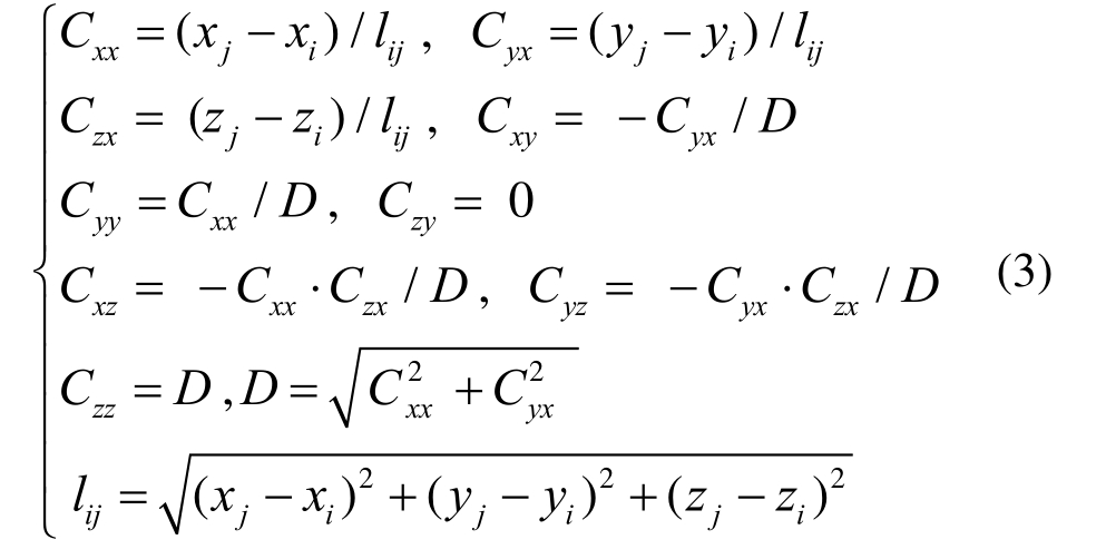 分别表示节点i在局部坐标系下3个坐标的位置偏移;Tij是单元坐标转换矩阵,Tij中各元素的计算如下:
