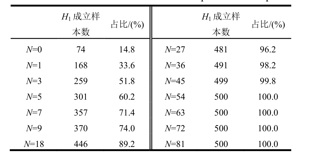 H1成立样本数 占比/(%)H1成立样本数 占比/(%)N=0 74 14.8N=27 481 96.2N=1 168 33.6N=36 491 98.2N=3 259 51.8N=45 499 99.8N=5 301 60.2N=54 500 100.0N=7 357 71.4N=63 500 100.0N=9 370 74.0N=72 500 100.0N=18 446 89.2N=81 500 100.0