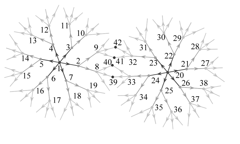 如图2所示,假定节点1、节点20为已知偏差的节点,即传播源,在第1传播步中,节点1、节点20为主节点,节点2~节点7和节点21~节点26分别为节点1和节点20的从属节点,箭头的指向为偏差传播方向;在第2传播步中,节点2~节点7和节点21~节点26转变为该传播步中的主节点,节点8~节点19,节点27~节点38为从属节点;以此类推。对于第1传播步的任意从属节点,其在整体坐标系下的位置偏差可表示为: