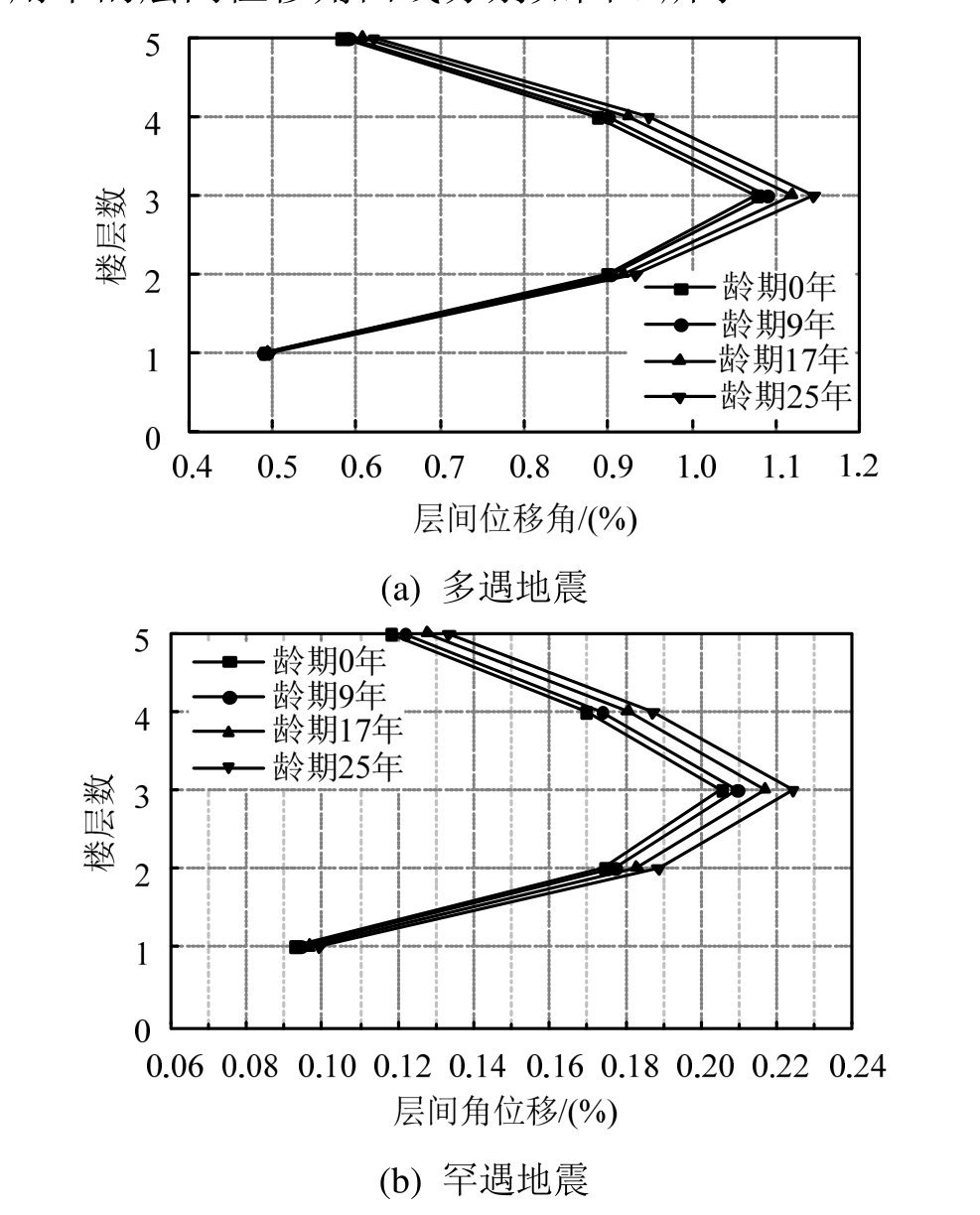 图8 不同龄期的钢框架结构层间位移角曲线