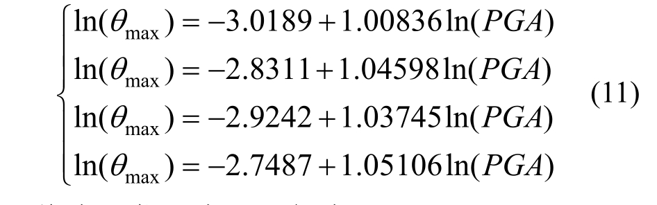 结构损伤指标和地震动强度指标分别为θmax和PGA。通过对不同龄期的结构进行动力增量分析,并根利用式(10)对进行对数线性拟合。分析结果如图10所示,拟合公式如下: