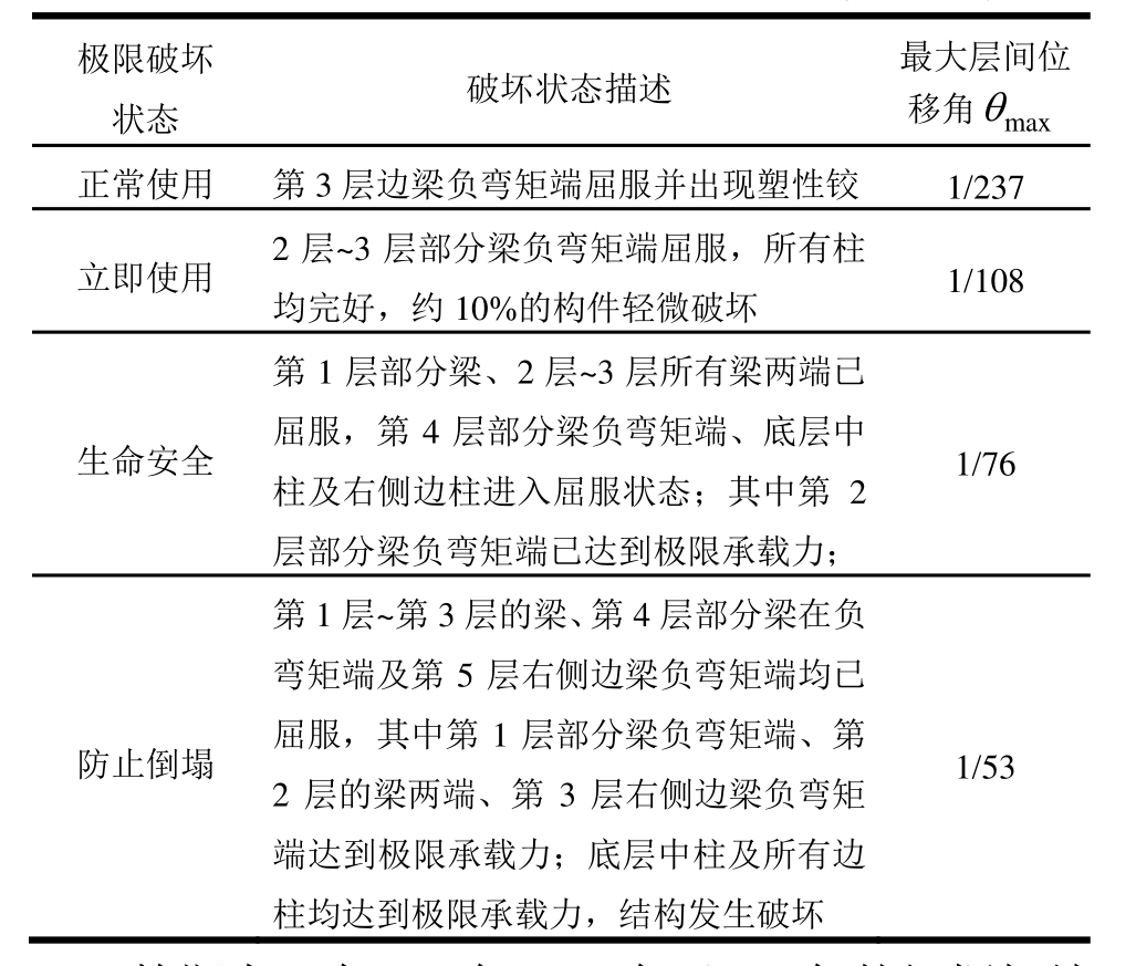 极限破坏状态 破坏状态描述 最大层间位移角θmax正常使用 第3层边梁负弯矩端屈服并出现塑性铰 1/237立即使用 2层~3层部分梁负弯矩端屈服,所有柱均完好,约10%的构件轻微破坏 1/108生命安全第1层部分梁、2层~3层所有梁两端已屈服,第4层部分梁负弯矩端、底层中柱及右侧边柱进入屈服状态;其中第 2层部分梁负弯矩端已达到极限承载力;1/76防止倒塌第1层~第3层的梁、第4层部分梁在负弯矩端及第5层右侧边梁负弯矩端均已屈服,其中第1层部分梁负弯矩端、第2层的梁两端、第3层右侧边梁负弯矩端达到极限承载力;底层中柱及所有边柱均达到极限承载力,结构发生破坏1/53