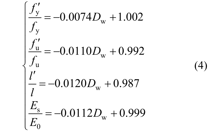 名义强度为实际荷载和相应钢板公称截面面积的比值。名义屈服强度和名义极限强度随着锈蚀率变化的关系式如式(4)、图6所示。