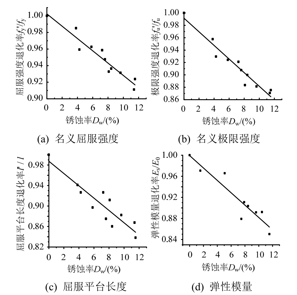 通过对锈蚀钢材进行单调拉伸力学试验,如图4所示,研究腐蚀对钢材的力学性能指标的影响。从图5可以发现随着钢材锈蚀程度不断增加,钢材的名义强度均呈下降趋势,屈服平台长度逐渐变短甚至消失,极限应变值减小。