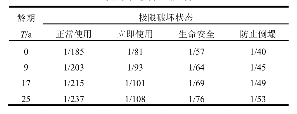 龄期为0年、9年、17年及25年的钢框架结构,极限状态时对应的量化指标限值如表7所示。