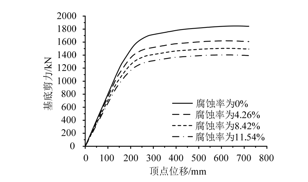 图7 锈蚀钢框架基底剪力-顶点位移曲线