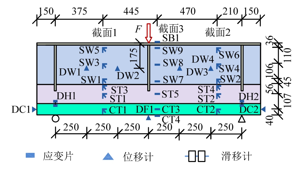 在距试验梁两侧支撑点各1/2Ls和1/2hs位置处取测试断面,沿梁截面高度布置应变花测点,测试试验梁剪切应变;在跨中截面布置应变测点测试轴向应变,布置百分表测试跨中挠度;在腹板布置百分表测试腹板面外变形;在钢梁与混凝土翼板交界面布置滑移计测试二者相对滑移;采用TDS-602静态数据采集仪对试验全过程的应变和位移进行数据采集。试验中,使用裂缝放大器来测试混凝土翼板裂缝发展情况。试验梁测点布置见图4。