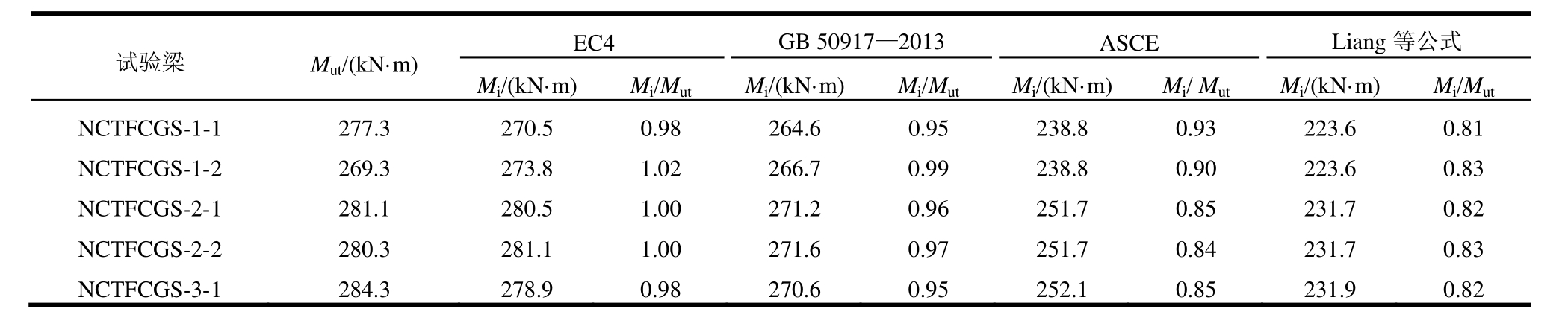试验梁Mut/(kN·m) EC4 GB 50917—2013 ASCE Liang等公式Mi/(kN·m)Mi/MutMi/(kN·m)Mi/MutMi/(kN·m)Mi/MutMi/(kN·m)Mi/MutNCTFCGS-1-1 277.3 270.5 0.98 264.6 0.95 238.8 0.93 223.6 0.81 NCTFCGS-1-2 269.3 273.8 1.02 266.7 0.99 238.8 0.90 223.6 0.83 NCTFCGS-2-1 281.1 280.5 1.00 271.2 0.96 251.7 0.85 231.7 0.82 NCTFCGS-2-2 280.3 281.1 1.00 271.6 0.97 251.7 0.84 231.7 0.83 NCTFCGS-3-1 284.3 278.9 0.98 270.6 0.95 252.1 0.85 231.9 0.82