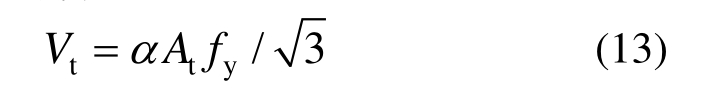 因承载能力极限状态下钢管上翼缘未达完全剪切屈服,为合理简化Vt计算,引入钢管应力折减系数α,则Vt可采用折减的圆钢管上翼缘塑性抗剪承载力,按下式计算: