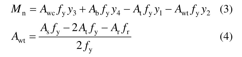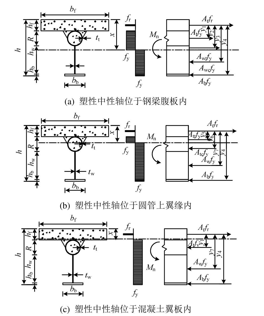理论计算图式如图 13(a)所示。图 13(a)中,x为塑性中性轴至混凝土翼板顶面的距离;Ar为混凝土翼板纵筋截面积;At、Awt、Awc、Ab及y1、y2、y3、y4分别为圆管上翼缘、受拉腹板、受压腹板、钢板下翼缘截面积及相应截面形心至混凝土翼板内纵筋截面形心的距离。