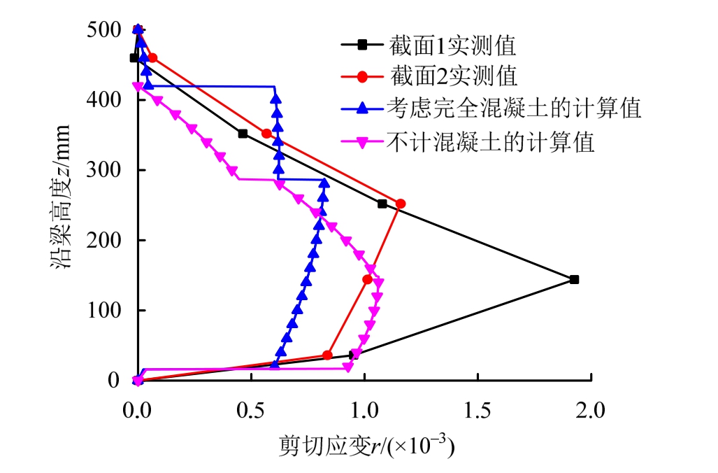 在混凝土翼板受拉开裂后,为分析负弯矩区圆管翼缘组合梁混凝土的抗剪作用,采用考虑完全混凝土(弹性无开裂)的抗剪作用与不计混凝土的抗剪作用两种截面剪应变计算方法,对比试验梁NCTFCGS-1-1在腹板剪切屈服前F/Fu=0.4时沿梁高方向的剪应变分布如图 12所示。其中,竖向剪应变按下式计算: