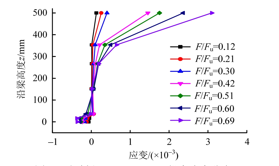 以 NCTFCGS-2-1为例说明。试验梁NCTFCGS-2-1截面 3沿梁高方向纵向应变分布如图9所示,图中z为距钢梁下翼缘底面高度。由图9可看出,试验梁纵向应变呈不均匀非线性分布,说明受小剪跨比构件剪切变形效应影响,截面变形已不能很好地符合平截面假定。