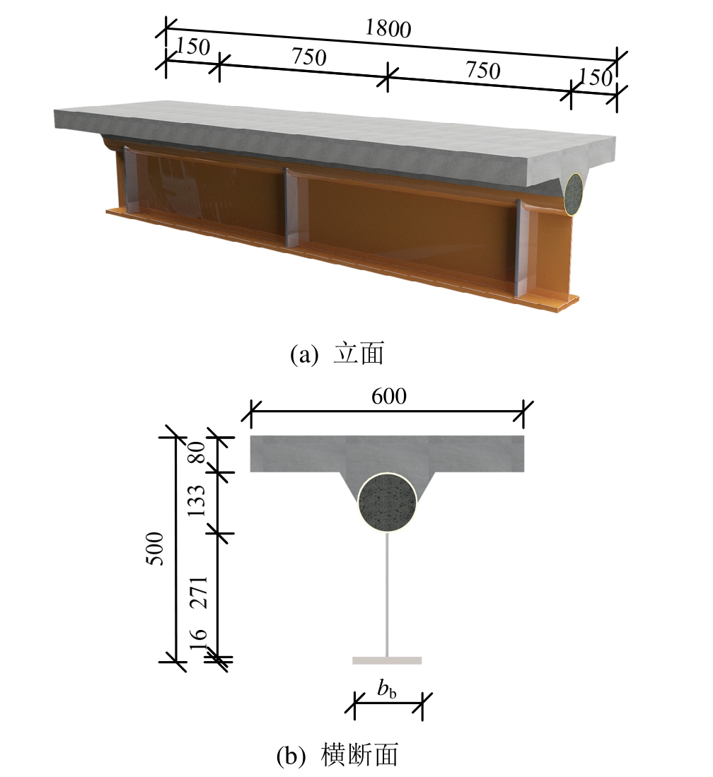 试验梁构造如图2所示。梁长L=1800 mm,计算跨径L0=1500 mm,剪跨长度Ls=750 mm,总梁高H=500 mm;混凝土翼板宽度bf=600 mm,厚度hf=80 mm;钢梁按密实截面设计,采用组件焊接而成,高度hs=420 mm;上翼缘圆钢管外径R=133 mm,壁厚tt=4 mm;腹板高度hw=271 mm,厚度tw=6 mm;下翼缘钢板厚度hb=16 mm。为防止腹板发生局部屈曲,在支撑及加载位置腹板双侧焊接12 mm厚加劲肋。混凝土翼板内按构造配置φ6光圆钢筋,纵筋分2层布置18根,箍筋按80 mm等间距布置22根。