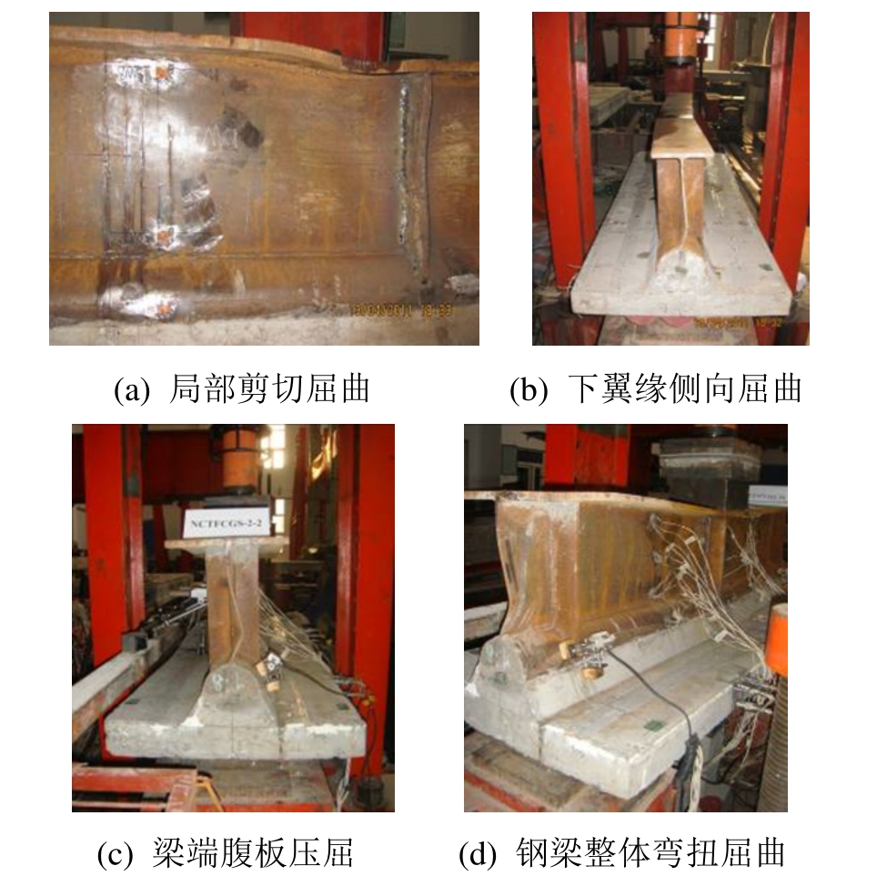 试验结果表明,所有试验梁的破坏过程为首先混凝土翼板受拉开裂退出工作,之后混凝土翼板内纵向钢筋屈服,在腹板发生剪切屈服后,试验梁钢梁发生局部剪切屈曲破坏而达到极限承载力。试验梁最终破坏时伴随有4种典型破坏形态:局部剪切屈曲、下翼缘侧向屈曲、梁端腹板压屈和钢梁整体弯扭屈曲,如图5所示。