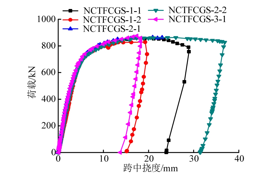 试验梁Mut/(kN·m)Vut/kNMn/(kN·m)Vn/kNMut/MnVut/Vn NCTFCGS-1-1 277.3 426.6 297.7 468.1 0.93 0.91 NCTFCGS-1-2 269.3 414.4 297.7 468.1 0.90 0.89 NCTFCGS-2-1 281.1 432.5 332.5 468.1 0.85 0.92 NCTFCGS-2-2 280.3 431.3 332.5 468.1 0.84 0.92 NCTFCGS-3-1 284.3 437.4 333.6 468.1 0.85 0.93