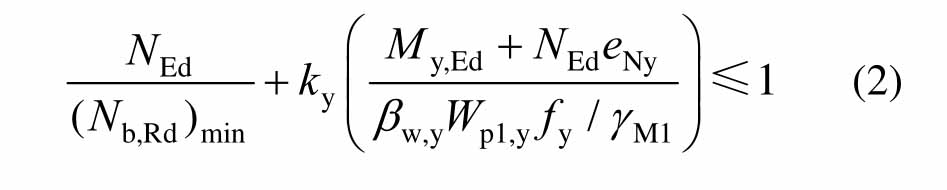 式中:NEd和My,Ed分别为轴力和最大弯矩设计值;(Nb,Rd)min为以下四种屈曲模态的轴力最小值:绕强轴屈曲、绕弱轴屈曲、扭转屈曲和扭转-弯曲屈曲;ky为相关系数;对于第 1、2类截面,βW,y=1.0;e为偏心距,分项系数γM1=1.1;Wpl,y为塑性模量。