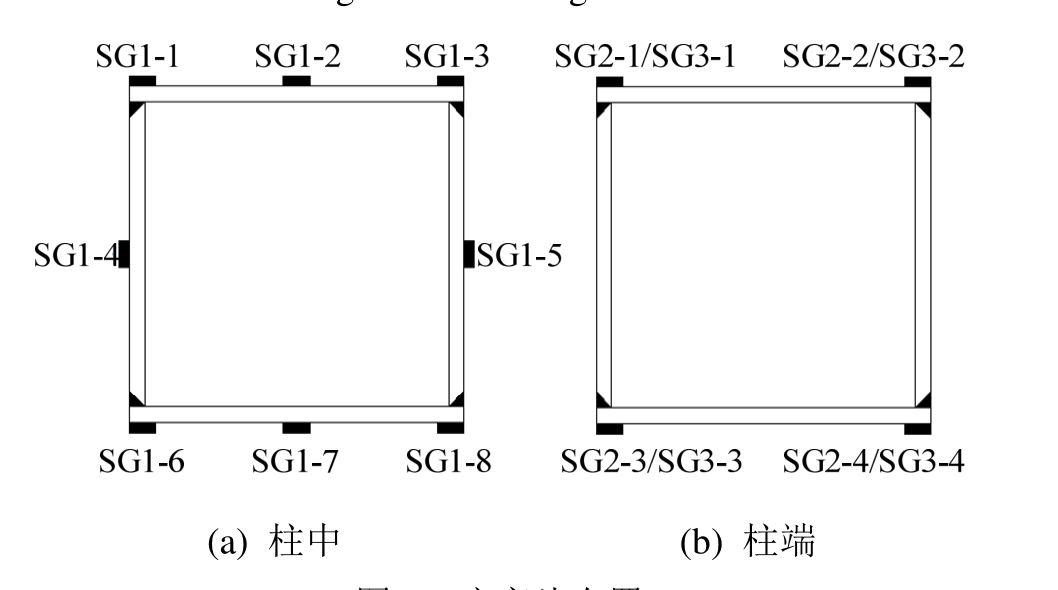 为了减少焊接对应变数据的影响,在距试件两端 20 mm(图 7(b)中截面 2-2、3-3)的棱边处分别布置4个应变片用于反算荷载初偏心(图8(b)),在柱中截面(截面 1)布置了 8个应变片用于分析试件临界截面在失稳前后的应变分布(图 8(a))。整个构件共布置有7个位移计,如图7(b)所示,柱中截面的LVDT-6和LVDT-7通过拉丝固定,用来测量柱中截面失稳平面内的水平位移,LVDT-5和固定在柱中的玻璃片接触,用来测量柱中截面失稳平面外的水平位移;在柱底单刀铰发生转动的对称位置布置两个位移计LVDT-1和LVDT-2,通过两者读数之差和间距得到柱端转角;构件的轴向压缩变形通过LVDT-3和LVDT-4测量。