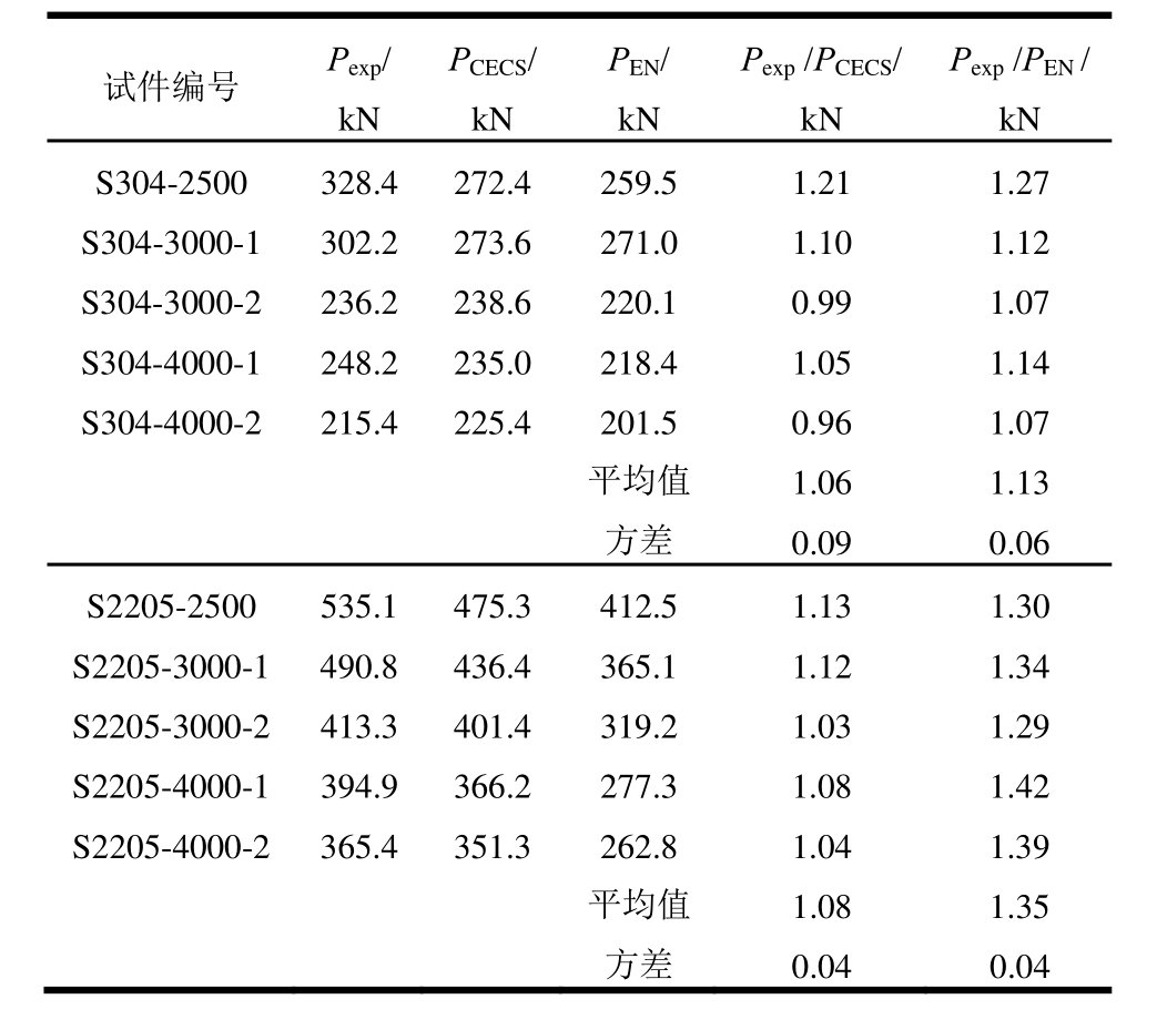 试件编号Pexp/kNPCECS/kNPEN/kNPexp/PCECS/kNPexp/PEN/kN S304-2500 328.4 272.4 259.5 1.21 1.27 S304-3000-1 302.2 273.6 271.0 1.10 1.12 S304-3000-2 236.2 238.6 220.1 0.99 1.07 S304-4000-1 248.2 235.0 218.4 1.05 1.14 S304-4000-2 215.4 225.4 201.5 0.96 1.07平均值 1.06 1.13方差 0.09 0.06 S2205-2500 535.1 475.3 412.5 1.13 1.30 S2205-3000-1 490.8 436.4 365.1 1.12 1.34 S2205-3000-2 413.3 401.4 319.2 1.03 1.29 S2205-4000-1 394.9 366.2 277.3 1.08 1.42 S2205-4000-2 365.4 351.3 262.8 1.04 1.39平均值 1.08 1.35方差 0.04 0.04