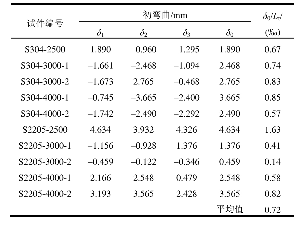 试件编号 初弯曲/mmδ0/Lt/(‰)δ1δ2δ3δ0S304-2500 1.890 -0.960 -1.295 1.890 0.67 S304-3000-1 -1.661 -2.468 -1.094 2.468 0.74 S304-3000-2-1.673 2.765 -0.468 2.765 0.83 S304-4000-1-0.745 -3.665 -2.400 3.665 0.85 S304-4000-2 -1.742 -2.490 -2.292 2.490 0.57 S2205-2500 4.634 3.932 4.326 4.634 1.63 S2205-3000-1 -1.156 -0.928 1.376 1.376 0.41 S2205-3000-2-0.459 -0.122 -0.346 0.459 0.14 S2205-4000-12.166 2.548 0.479 2.548 0.58 S2205-4000-2 3.193 3.565 2.428 3.565 0.82平均值 0.72